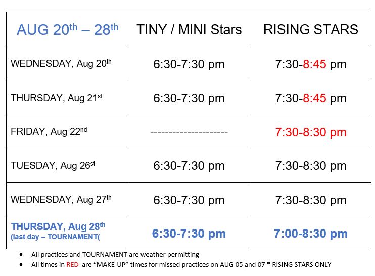 ⭐ Rising Stars play until: 8:25 PM – TINY-MINI till 7:30 PM