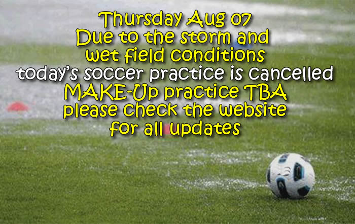 Due to the storm and wet field conditions, today’s soccer practice is cancelled.
