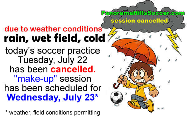 Soccer practice July 22 cancelled * MAKE-UP session Wednesday July 23 * weather permitting
